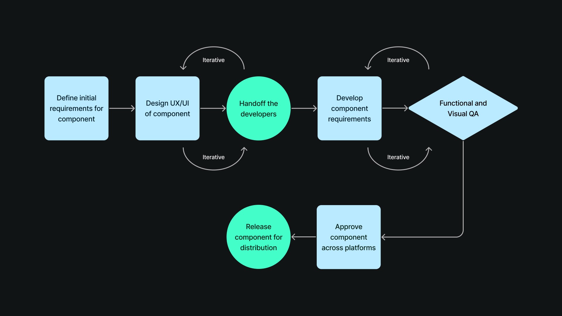 Our process for designing components is highly collaborative. We start by researching the component and understanding why it's needed in our product. We then focus on ensuring our components are reusable, extendable, accessible, and well-documented. We follow a agile process that ensures we ship quality components.