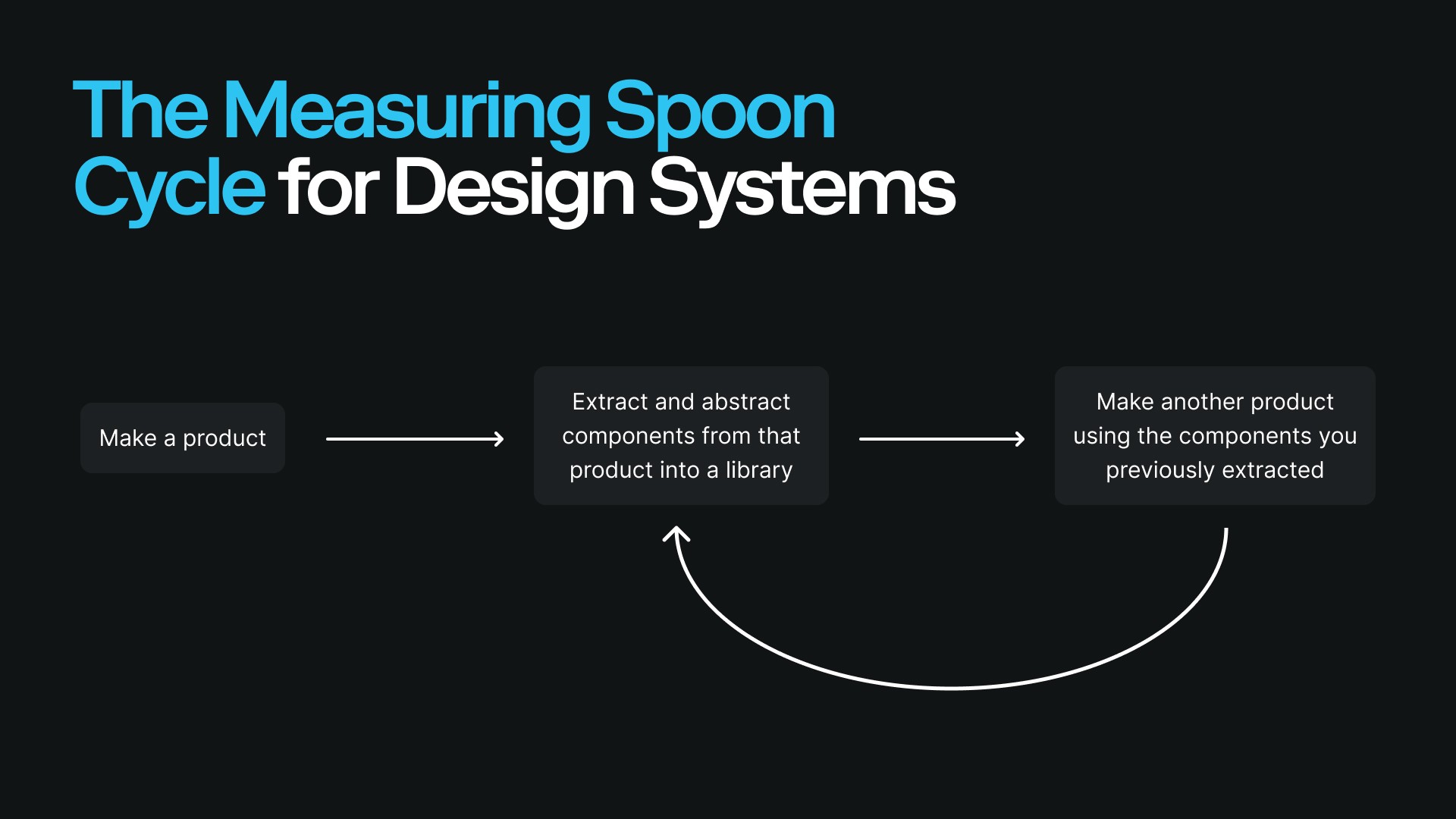 I proposed to my team to follows a process called the Measuring Spoon Cycle. This cycle provides us with an efficient framework that ensures parallel progress with our product team's roadmaps. As we ship more product experiences, our Design System becomes more mature.