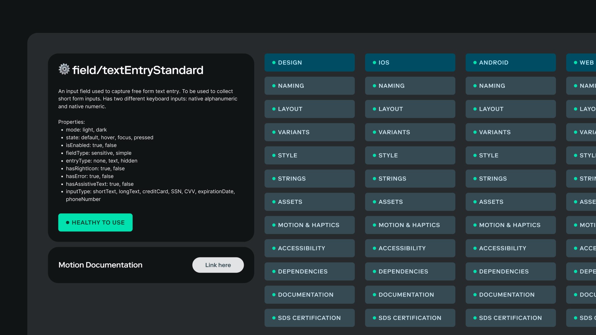 Once our components were approved and certified, we would update their status in Figma to "healthy to use" across platforms. This would ensure that designers and developers have full transparency on what components are available and can be used with confidence.